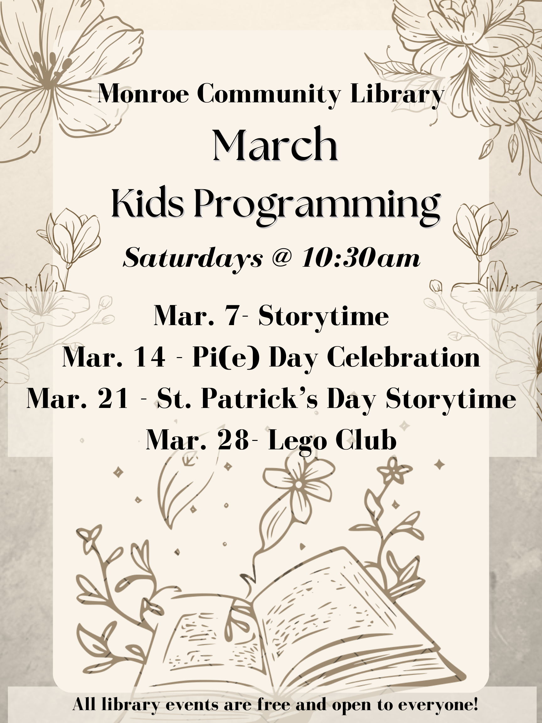 Join the Monroe Community Library for story time Saturday at 10:30am! We will read a book out loud, create a craft, and enjoy a snack. Come spend time at the library with friends!