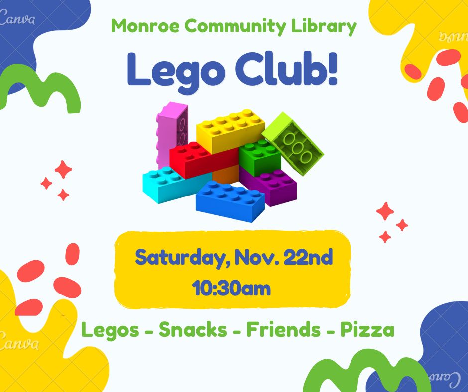Join us for Lego Club Saturday @ 10:30am. Lego Club is for kids of all ages (and towns) and Legos and Duplos are provided. Kids' creations can be put on display in the library for all to see. We also provide snacks. Hope to see you there!